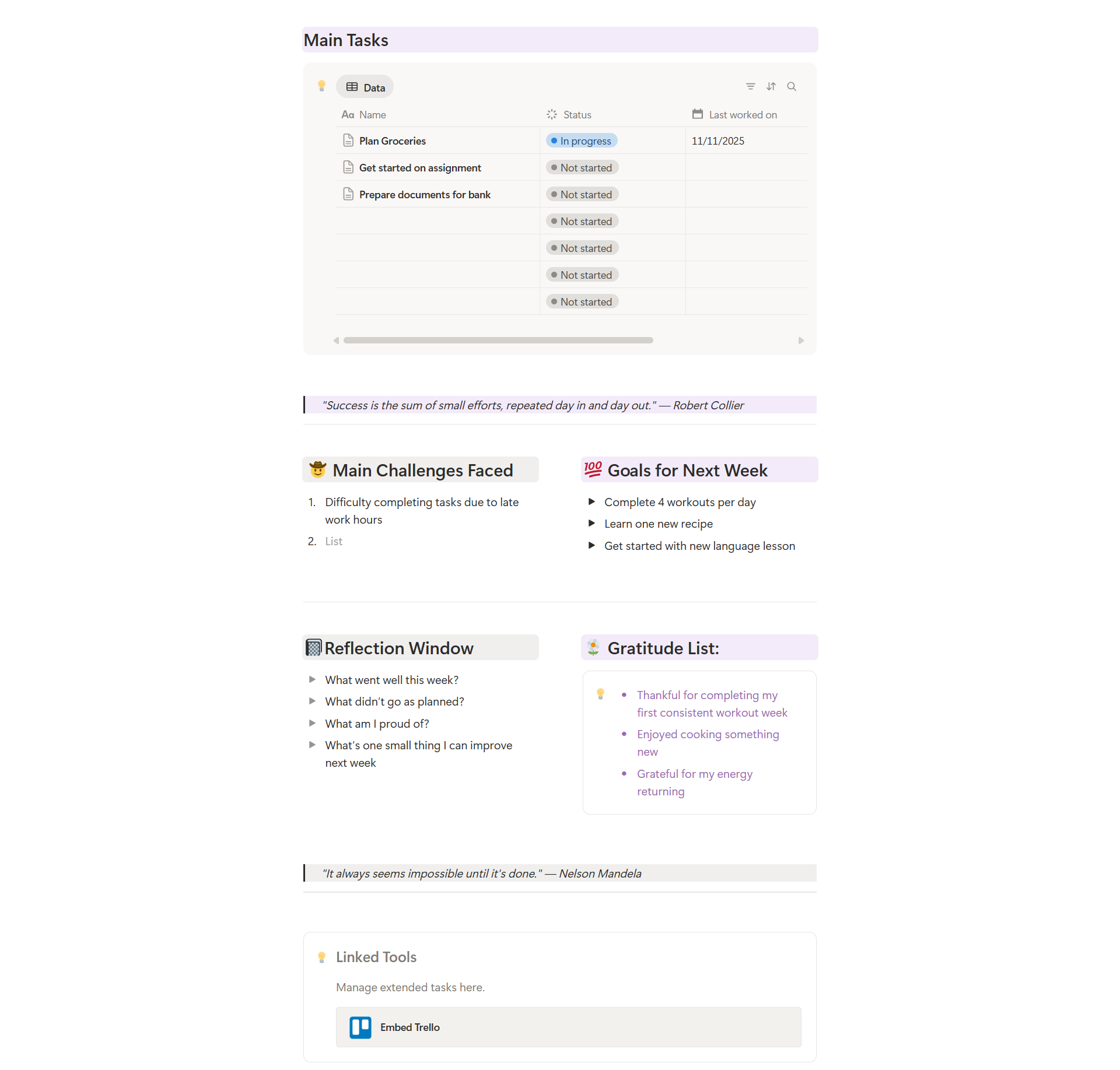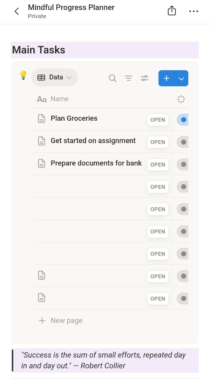 Mindful Progress Planner is a clean and structured Notion template designed to help you plan intentionally and reflect peacefully. Whether you’re tracking weekly goals, noting challenges, or recording small wins, this planner keeps everything in one calm space; no clutter, no overwhelm.